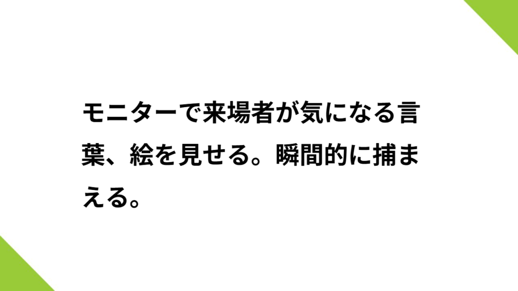 多くの企業がブースにモニターを設置していますが、映像がただ流れているだけでは、来場者の足は止まりません。