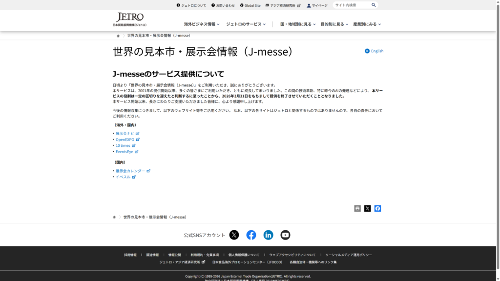 2026年3月31日、JETRO(日本貿易振興機構)が提供してきた展示会情報サービス「J-messe」が終了。